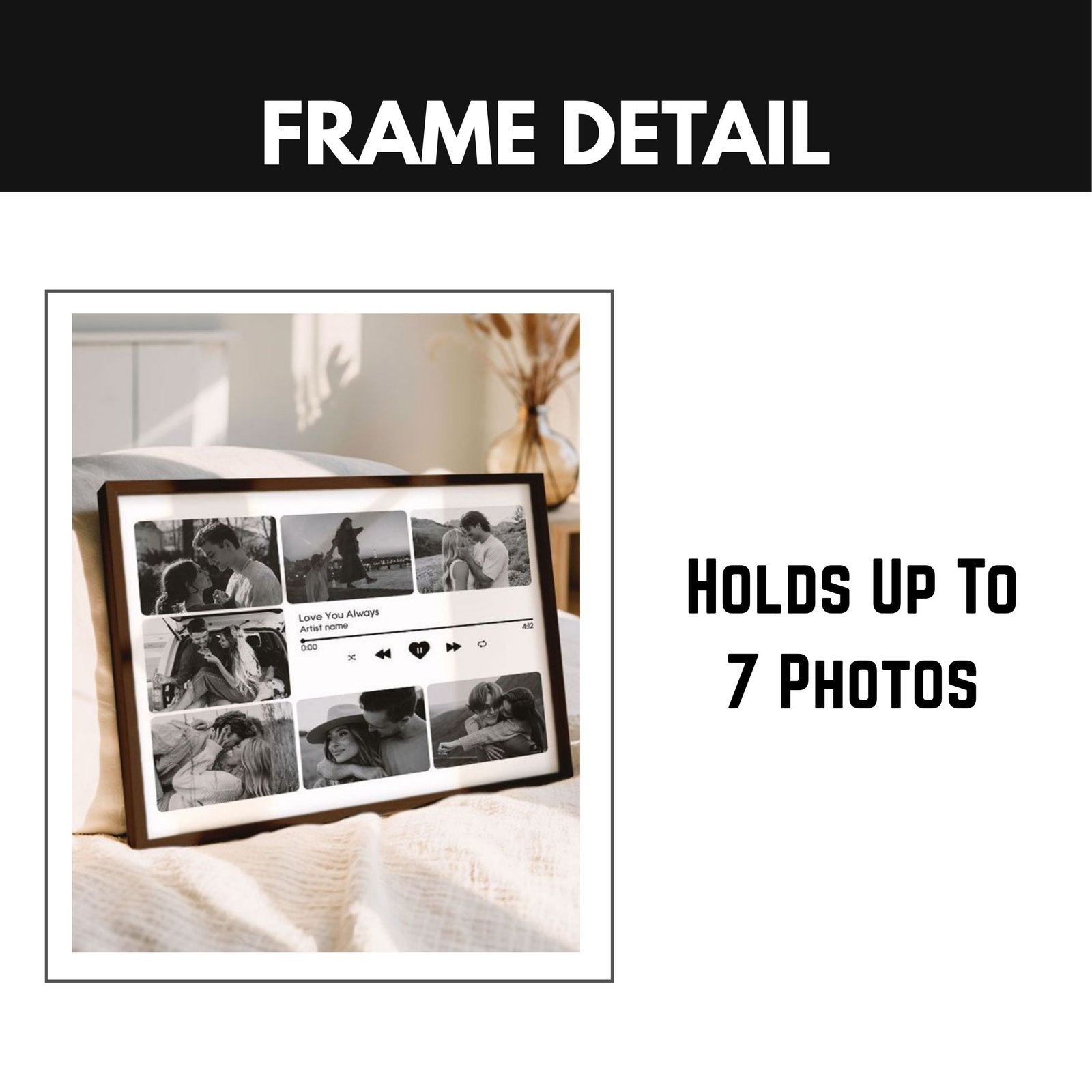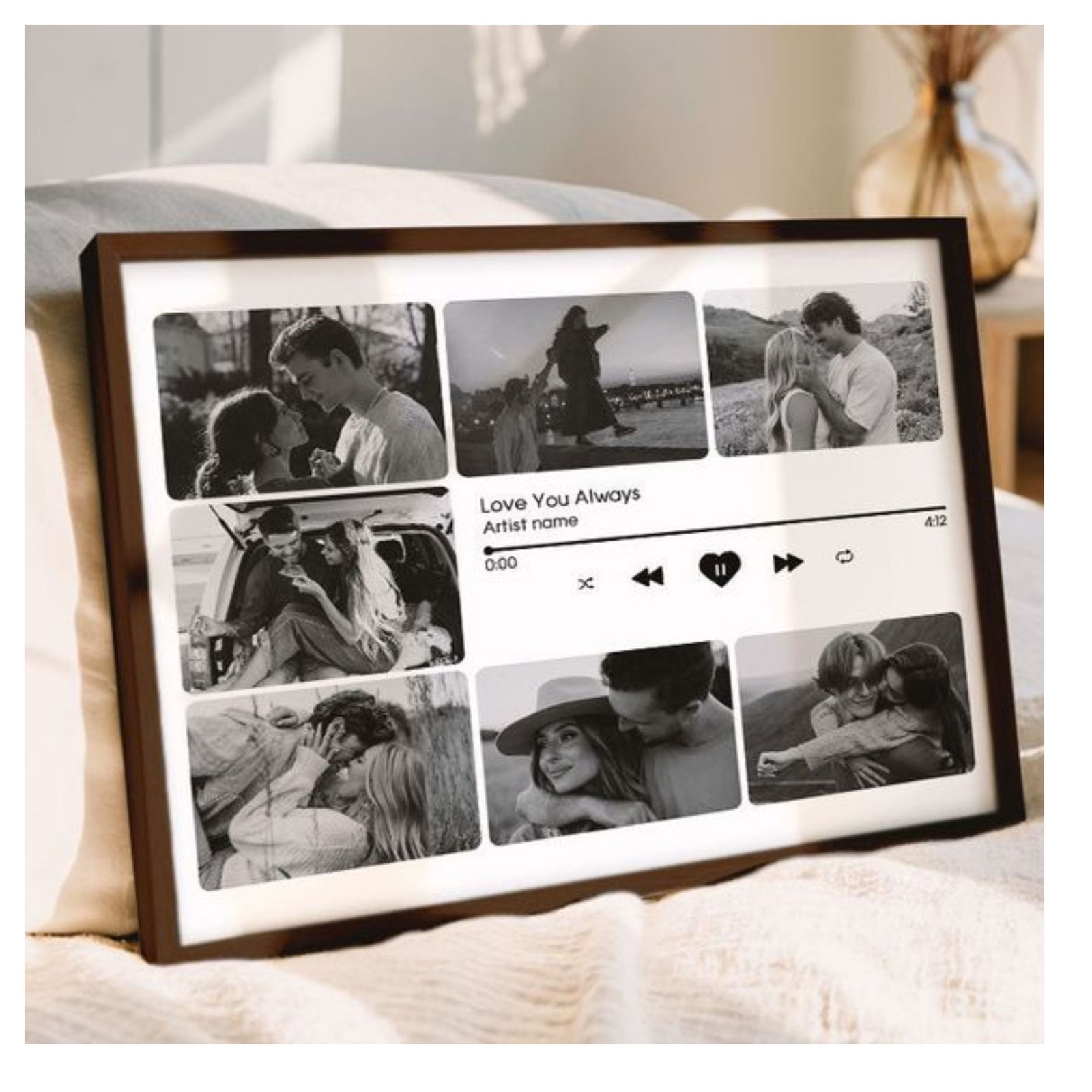 Turn your favorite love song and memories into a timeless keepsake with this Custom Music Player Photo Frame. Inspired by the popular Spotify-style layout, this frame showcases your chosen photos alongside your favorite song title, artist name, and playback design, creating the look of a real music player.