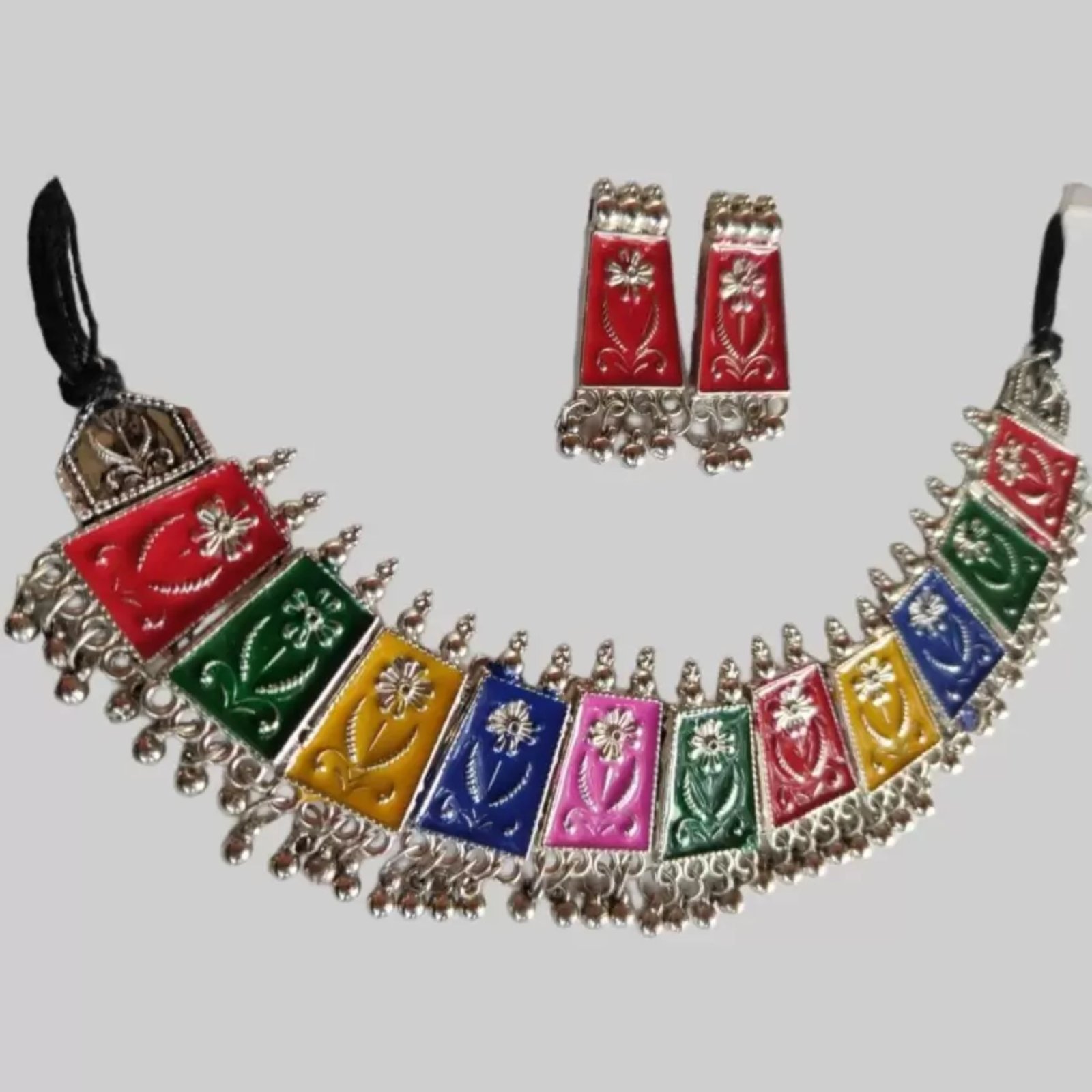 Introducing our stunning Oxidised Silver, Alloy Multicolor Jewel Set, a perfect blend of traditional and contemporary design. This set includes a choker and two matching earrings, ideal for women and girls who appreciate stylish jewelry.