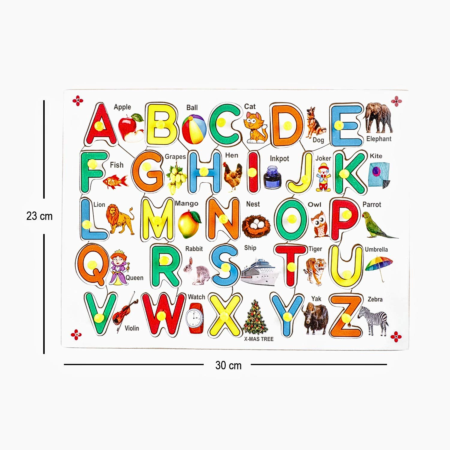Each alphabet piece is thoughtfully designed with a peg knob for easy gripping, helping your child improve fine motor skills and hand-eye coordination while learning letters A to Z. The vibrant color palette and familiar object associations (like “A for Apple”) help boost cognitive development, visual recognition, and phonics awareness in a playful manner.